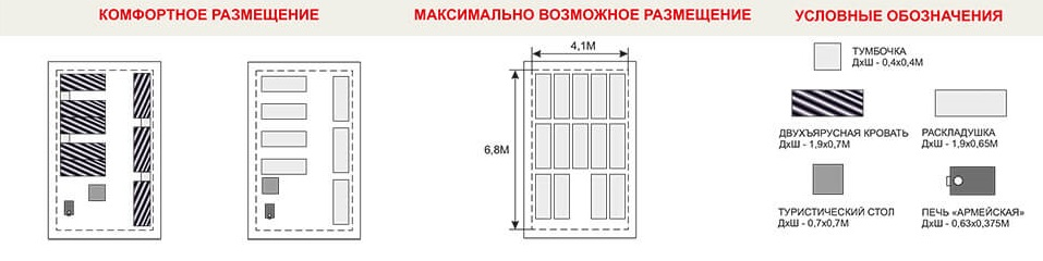 • Палатка имеет вход, вентиляционные окна и отверстие в крыше для вывода печной трубы. На торцевых стенках расположены по два окна, оснащенных противомоскитными сетками и светозащитными шторками. Противомоскитная сетка вварена в оконный проем; прозрачный пластик ПВХ закатывается в специальные клапана. Специальный клапан имеет ширину 120 мм – 130 мм. Данная система клапана позволяет иметь 100% защиту от ветра и дождя.